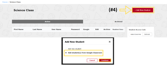 - From the “Roster,” click “+ Add New Student.” Select “Add student(s) from Google Classroom” and “Continue.”